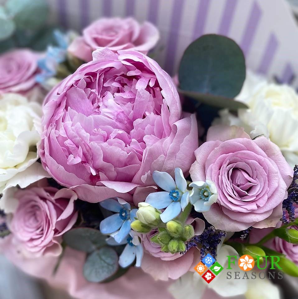 Цветы в коробке: пионы, гвоздика, фрезия, оксипеталум, роза кустовая, лимониум, эвкалипт (15)