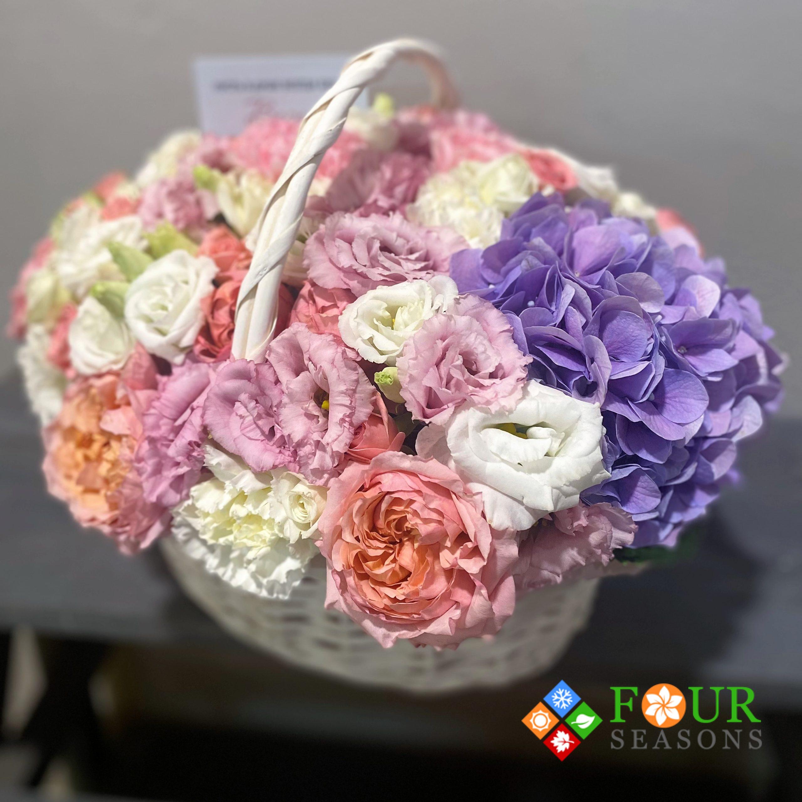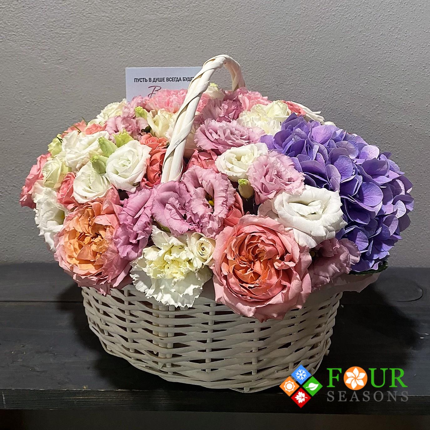 *Готовая корзина может отличаться от образца на фотографии, ведь каждая композиция уникальна. Наши флористы тщательно подходят к подбору цветов и прикладывают все усилия для того, чтобы цветовая гамма и форма максимально соответствовали образцу.